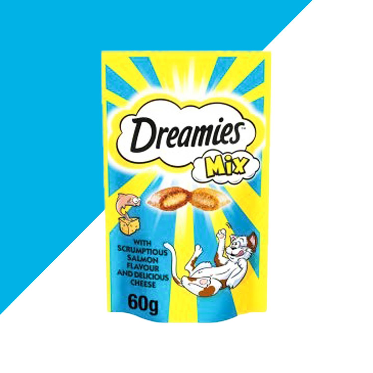 تشویقی گربه دریمیز با طعم ماهی سالمون و پنیر (Dreamies Cat Treats Mix with Scrumptious Salmon and Delicious Cheese)، برای گربههای بالای ۶ ماه مناسب میباشد.