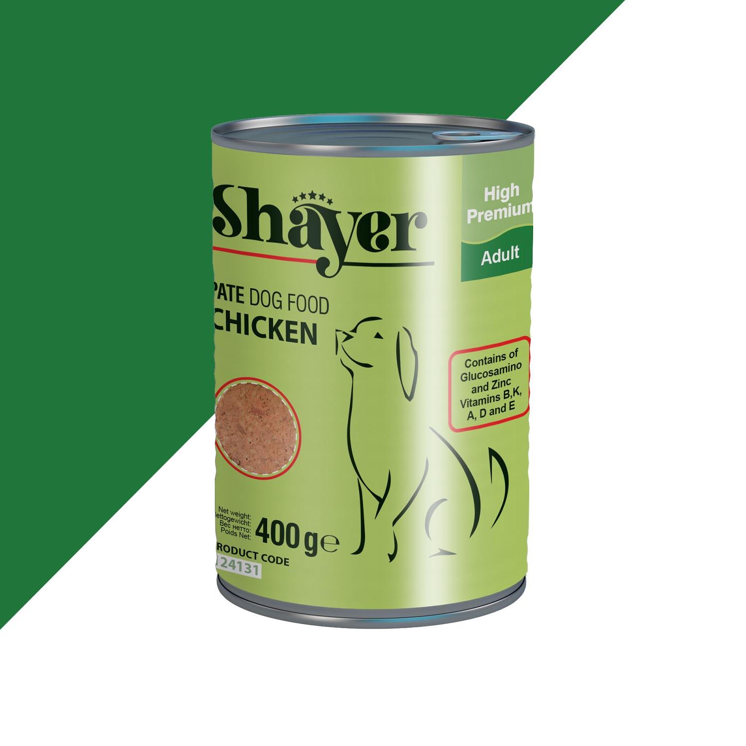 کنسرو سگ شایر با طعم مرغ حاوی امولسیون یکنواخت شده‌ی گوشت مرغ همراه با جگر، کمی برنج، هویج، نخود سبز، کلم و استخوان می‌باشد. مرغ دارای ویتامین‌های مختلف نظیر ویتامین C، ویتامین B6، ویتامین B3، ویتامین B12، ویتامین E، ویتامین D، ویتامین K، ویتامین B9، ویتامین B2 و ویتامین B1 می‌باشد.