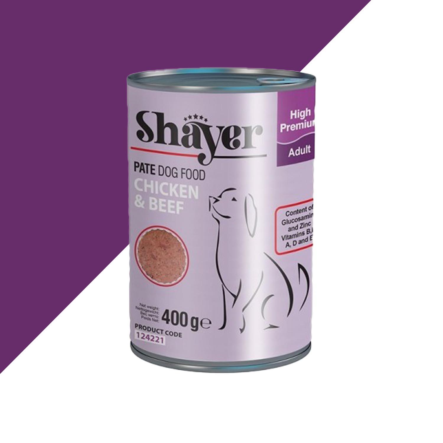 کنسرو سگ شایر پته مرغ و گوشت قرمز، حاوی امولسیون یکنواخت شده مرغ و گوشت قرمز همراه با جگر، کمی برنج، هویج، نخود سبز، کلم و استخوان میباشد. گوشت مرغ و گوشت قرمز به دلیل منابع غنی از انرژی و پروتئین، باعث ساخت ماهیچه می شوند و برای افزایش قدرت بافتهای بدن و سلولهای قلب ضروری هستند و کمک به سهولت عملکرد این اعضا میکنند.