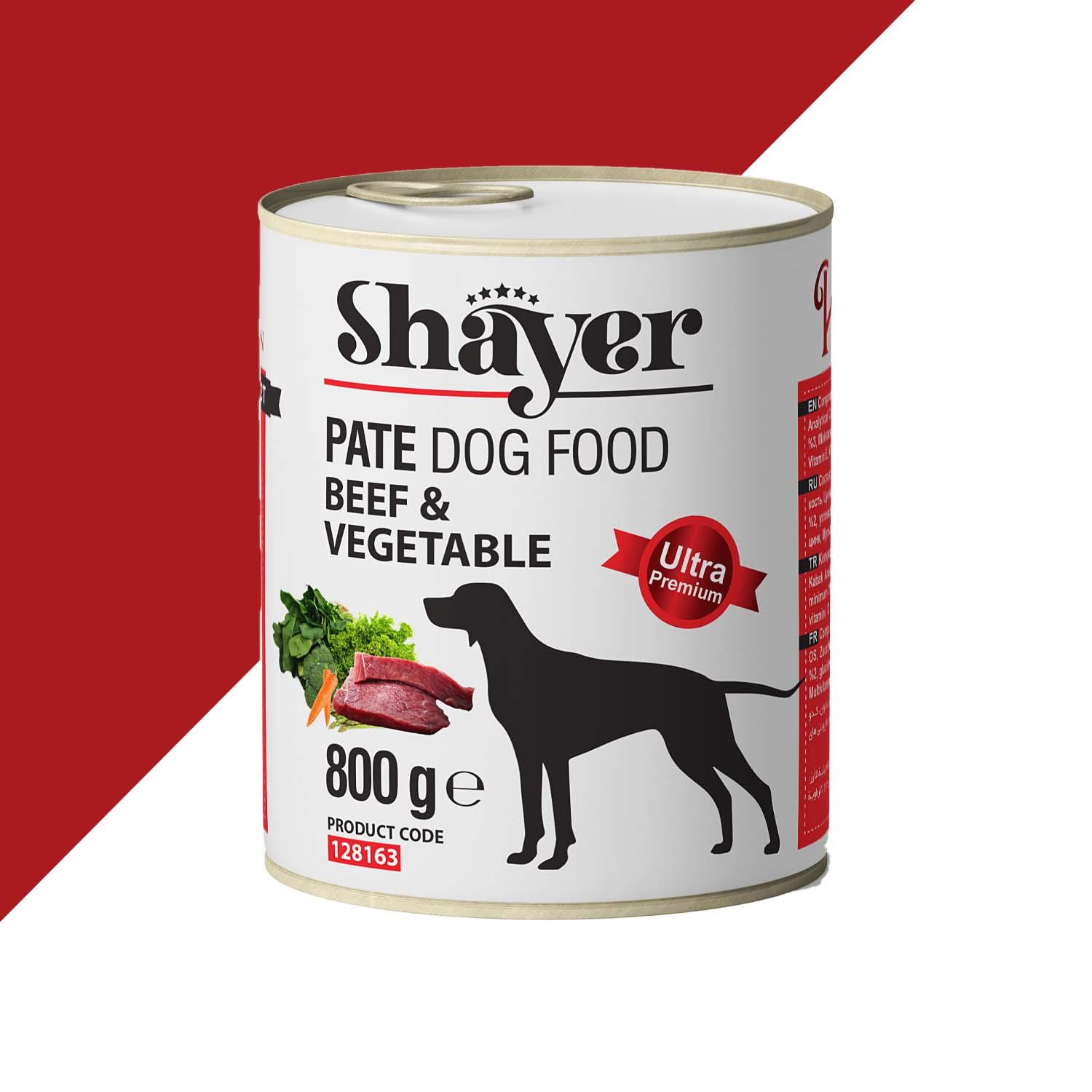 کنسرو سگ شایر با طعم گوشت قرمز حاوی امولسیون یکنواخت شدهی گوشت قرمز همراه با جگر، برنج، هویج، نخود سبز، کلم و استخوان میباشد. گوشت قرمز از طریق آهن موجود در خود، باعث خون رسانی به بدن حیوان و تامین هموگلوبین میشود.