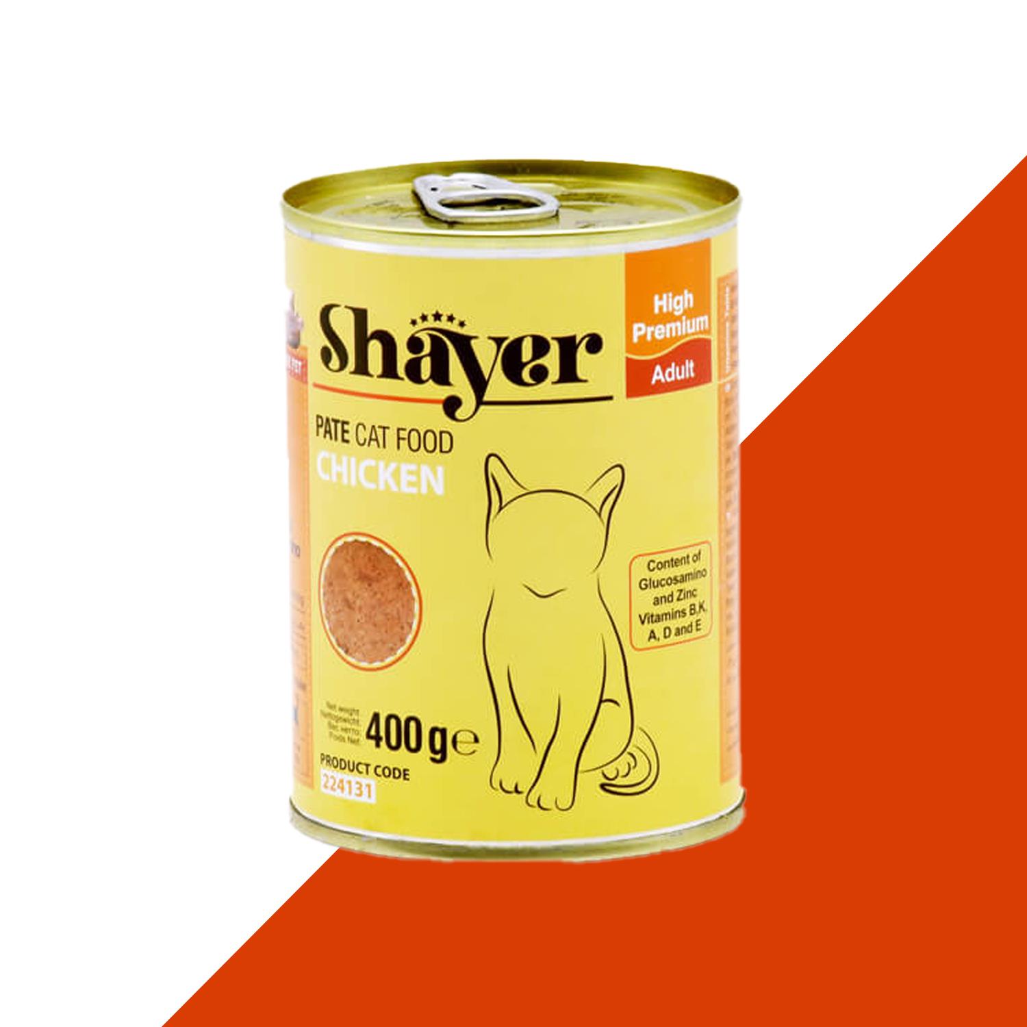 این کنسرو پته گربه 400 گرمی Shayer حاوی پروتئین، کربوهیدرات، مواد معدنی، فیبر و چربی، ترکیب مایعات و افزودنیهای طبیعی مغذی و فاقد شکر، نمک و گلوتن میباشد و در آن از پرکننده (Filler) استفاده نشده است. به دلیل وجود افزودنیهای طبیعی، گلوکوزامین و زینک، باعث استحکام استخوان در تمامی سنین میشود و با توجه به داشتن مقدار قابل ملاحظهای از امگا 3 و 6 به نگهداری سلامت پوست و مو و همچنین رشد مو کمک قابل توجهی مینماید.