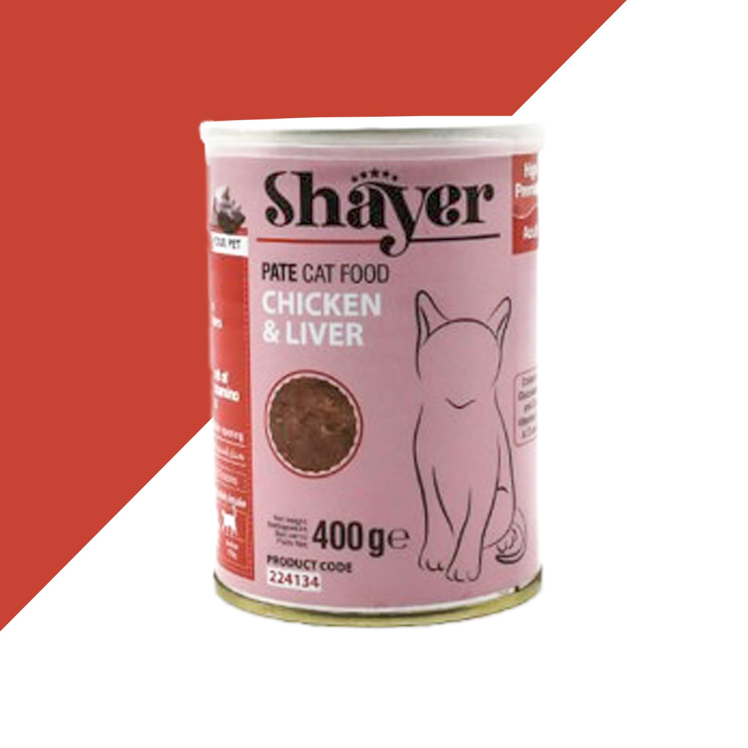 کنسرو گربه شایر با طعم مرغ و جگر در سس گوشت بصورت پته یا چرخ شده مرغ و جگر مرغ و حاوی 90 درصد گوشت مرغ و جگر و 10 درصد ترکیب شترمرغ و بوقلمون همراه با کمی برنج، هویج، نخود سبز در آب غلیظ شده سس گوشت است.