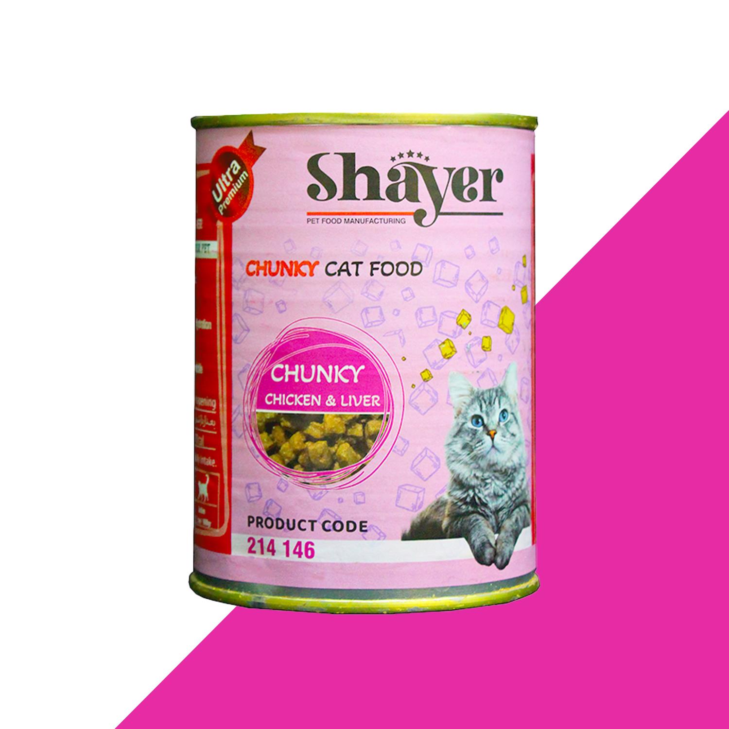 کنسرو گربه شایر چانکی طعم مرغ و جگر همراه با ویتامین و پروتئین و فیبر بالا تهیه میشود. این کنسرو به دلیل نوع و نحوه تولید فاقد هرگونه مواد نگهدارنده و مضر میباشد. این کنسرو مدل چانکی همانند مدل خورشتی بوده که از تکههای گوشت مرغ و جگر در سس گوشت تهیه شده است. این کنسرو خوشمزه و لذیذ از گوشت تازه مرغ تولید میشود که به خوبی نیازهای پروتئینی گربهها را تامین میکند. مقادیر بالای پروتئین مناسب جهت ساخت ماهیچهها، افزایش قدرت بافتهای بدن و سلولهای قلب میباشد.